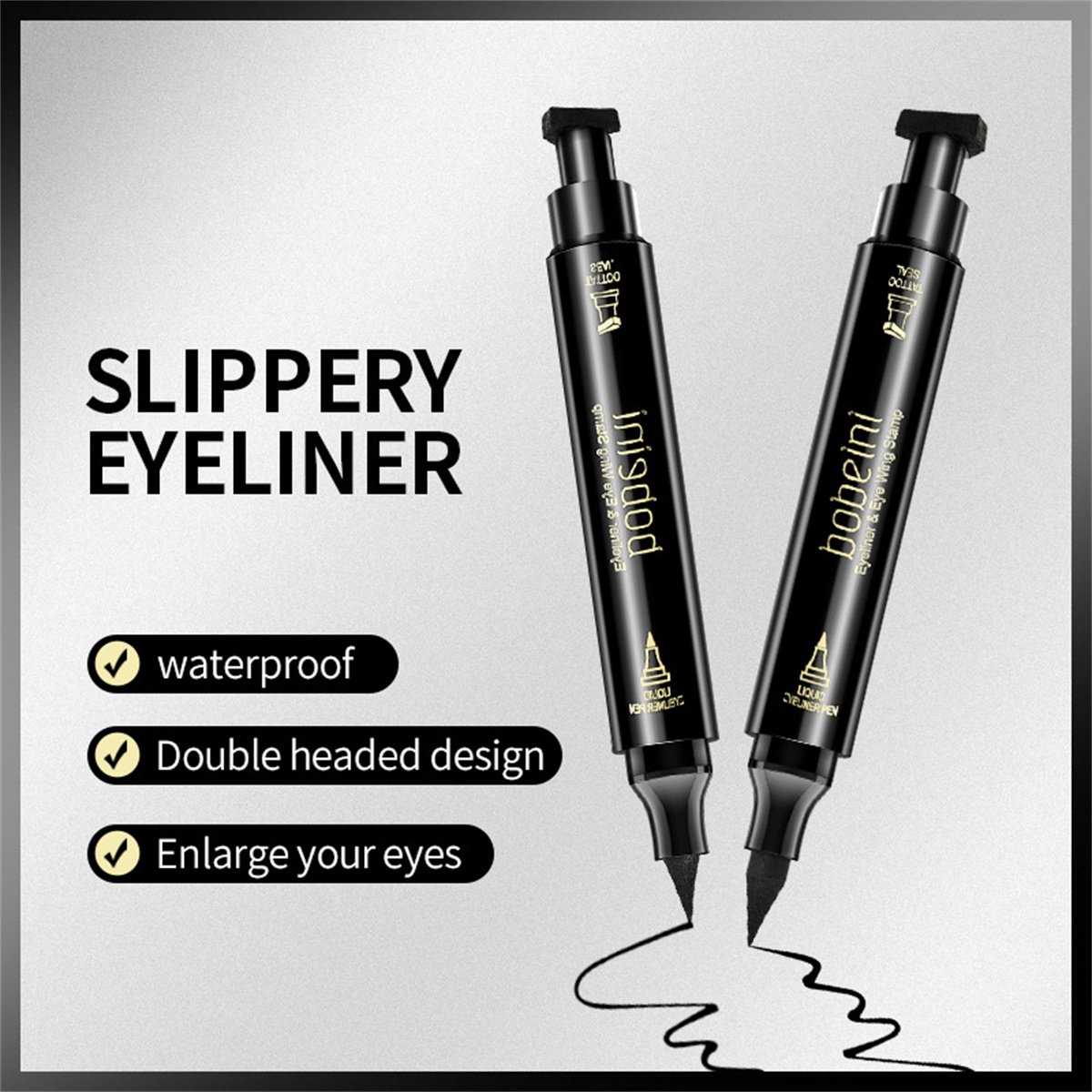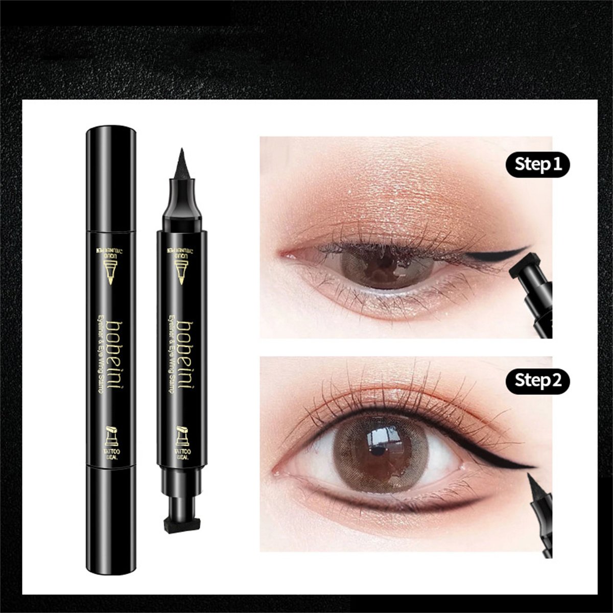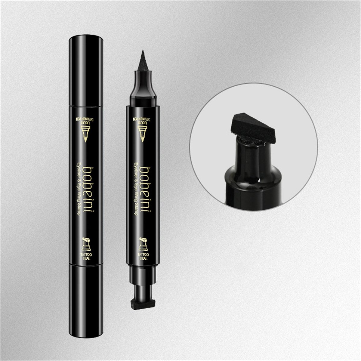 1.One side is eyeliner pencil, the other side is eyeliner stamp tattoo pen for eye makeup. It make eye makeup no longer monotonous and add a sense of activity to the overall makeup, making people impressive.
